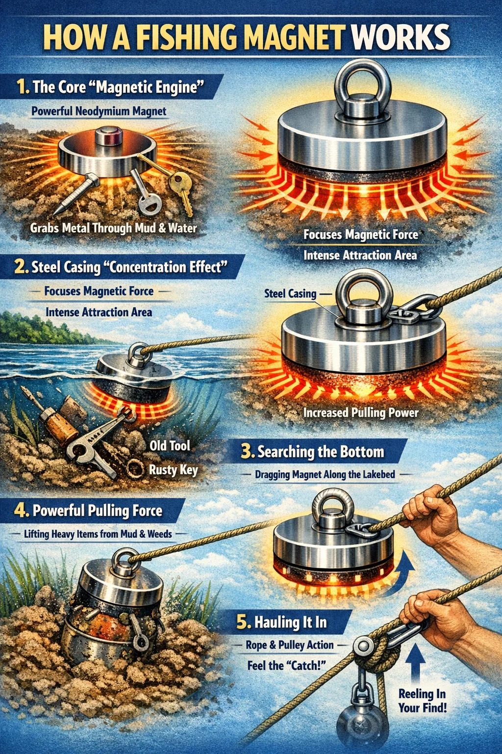 বুঝতে কিভাবে a মাছ ধরার চুম্বক কাজ করে, আপনি এটিকে একটি সুপার-পাওয়ারড "আন্ডারওয়াটার ভ্যাকুয়াম ক্লিনার" হিসাবে কল্পনা করতে পারেন, ধুলোর পরিবর্তে এটি ধাতুকে চুষে নেয়।