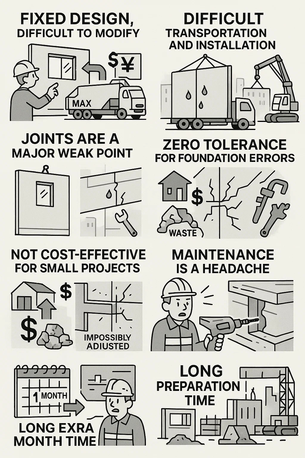 দীর্ঘ নকশা চক্র: নির্মাণ শুরু হওয়ার আগে সমস্ত বিবরণ চূড়ান্ত করতে হবে, এবং কাস্ট-ইন-প্লেস নির্মাণের তুলনায় একটি অতিরিক্ত মাস সময় নিয়ে অঙ্কনগুলি বারবার পরীক্ষা করতে হবে।