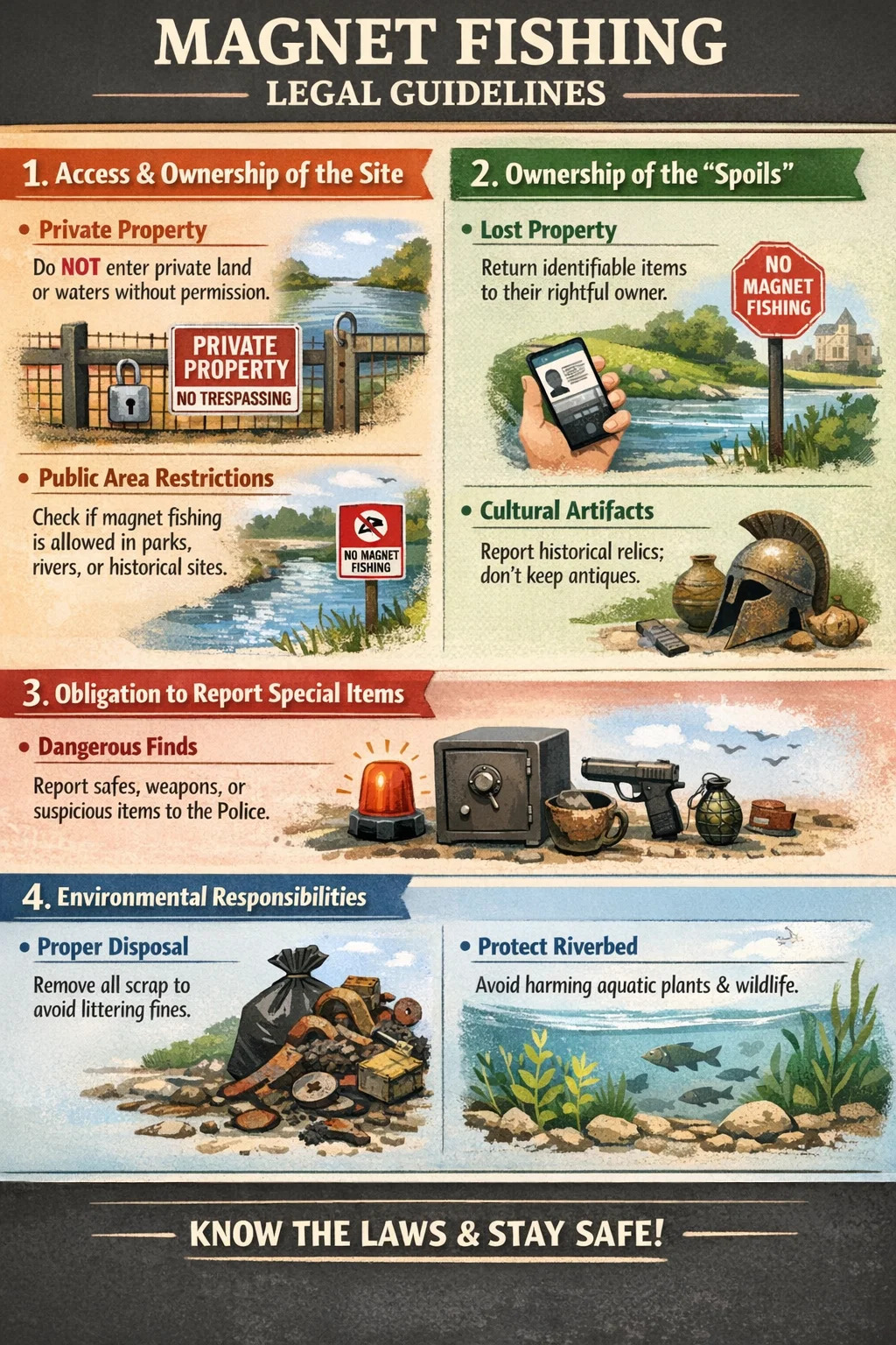 চুম্বক মাছ ধরার আগে, প্রাসঙ্গিক আইন এবং প্রবিধানগুলি বোঝা অত্যন্ত গুরুত্বপূর্ণ। যদিও এই ক্রিয়াকলাপটিকে অনেক জায়গায় পরিবেশ পরিষ্কার করার একটি ইতিবাচক উপায় হিসাবে বিবেচনা করা হয়, আইনগতভাবে, এটি বিভিন্ন দিক যেমন জমির অধিকার, পুনরুদ্ধার করা জিনিসগুলির মালিকানা এবং জননিরাপত্তার সাথে জড়িত।