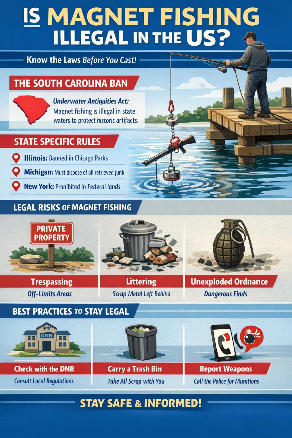 চুম্বক মাছ ধরা হয় ফেডারেল পর্যায়ে অবৈধ নয় মার্কিন যুক্তরাষ্ট্রে, তবে এটি নির্দিষ্ট রাজ্য, শহর এবং এখতিয়ারে কঠোরভাবে নিয়ন্ত্রিত বা সম্পূর্ণ নিষিদ্ধ। সবচেয়ে উল্লেখযোগ্য নিষেধাজ্ঞা হল দক্ষিণ ক্যারোলিনা , যেখানে আন্ডারওয়াটার অ্যান্টিকুইটিস অ্যাক্ট ব্যবহার নিষিদ্ধ করে মাছ ধরার চুম্বক রাষ্ট্রীয় জলসীমা থেকে নিদর্শন সংগ্রহ করা। অন্যান্য রাজ্যে, বৈধতা নির্ভর করে স্থানীয় অনুপ্রবেশ আইন, পরিবেশগত সুরক্ষা, এবং প্রাকৃতিক সম্পদ বিভাগ (DNR) আদেশের উপর।